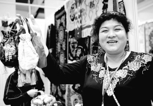 10月25日,新疆参展商阿加古丽在义博会展位上叫卖维吾尔族工艺品。 当日,第16届中国义乌国际小商品博览会落下帷幕。据统计,为期5天的展会吸引了13万余名海内外客商参会,实现展览成交额127.67亿元,比上届增长10.6%。 新华社发(张建成 摄)