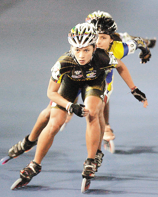 25日,哥伦比亚选手斯蒂芬·乌尔塔多(前)在2010年世界杯轮滑赛女子青年组1000米决赛中夺得金牌。 新华社发