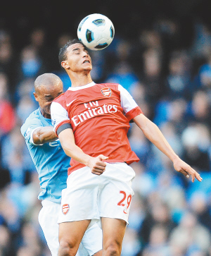 | 25日,在英超联赛中,阿森纳队客场以3:0战胜曼城。阿森纳队查马克(右)与曼城队科姆帕尼争抢头球。 新华社发 |