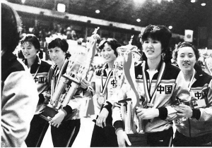 | 1981年11月16日,中国女排姑娘手捧世界冠军金杯步出赛场(左二为曹慧英)。