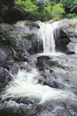 转弯一看,确有一道瀑布,不过是人造的。原来罗帅村为了灌溉,在溪水上游峡谷处修了一座水库,雨水充沛,泄洪时形成了一片瀑布。