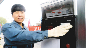 11月1日,电动汽车充电站工作人员正在进行充电刷卡。 当日,青海省首座电动汽车充电站在西宁经济技术开发区乐家湾正式投入运营,该充电站可同时为16台电动汽车提供充电服务。 新华社记者 王宇天 摄