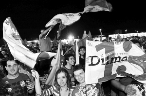 | ←10月31日,在巴西首都巴西利亚,支持者庆祝迪尔玛·罗塞夫当选总统。→ |