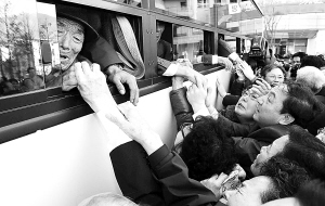 →坐在车上的朝鲜离散家属在金刚山地区与来自韩国的亲人告别。