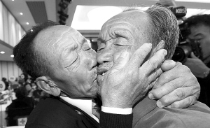 | ?邗一位朝鲜老人(右)在金刚山地区与来自韩国的弟弟相拥告别。 |
