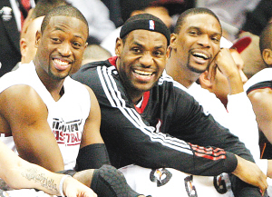 北京时间11月1日,在NBA常规赛中,迈阿密热火队客场以101比78战胜新泽西网队。图为大局已定后,热火“三巨头”韦德(左)、詹姆斯(中)和波什在场边观战。 新华社发