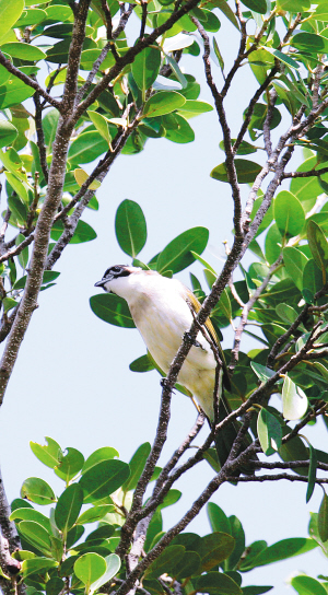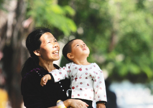 11月1日上午10时许,三亚市河西路人行道的绿树上,一群群小鸟不停地飞来飞去,寻找树上的果实。小鸟的鸣叫声,吸引着无数市民驻足观看。 上图:祖孙一起赏鸟。右图:小鸟在榕树上觅食。 特约记者 孙清 摄