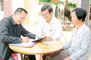 11月2日,人口普查员(左)在文昌市文城镇大潭村委会后坡村一户受灾农民家进行人口登记。当日,省第六次全国人口普查领导小组部分工作人员,来到文城镇普查办召开座谈会,调查了解在灾后重建中开展人口普查遇到的问题。 本报记者 苏晓杰 摄