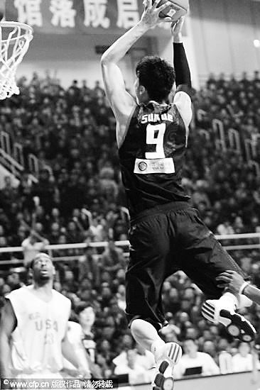 11月2日,中国男篮在许昌与美国明星队进行第三场热身赛,结果中国队以92:86获胜。图为中国队员孙悦暴扣。 小新发