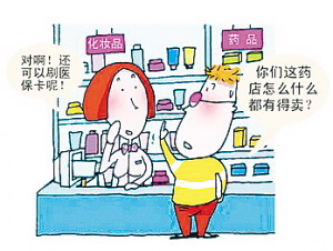 记者在昆明市滇池路的云南健之佳连锁健康药房某分店看到,这家药店靠门口的店面放满了化妆品、洗发水、食品、饮料、纸巾等日用品,里面才是专门的药品陈列架。店里有两个结账台,靠门口的是现金结账,靠里的是医保卡结账,表面上似乎分得很清楚。但实际上,进入药店的人可以用医保卡购买任何物品。