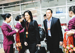 11月3日,桂林两江国际机场的服务人员给首批抵达的游客赠送壮族绣球。 当日,新加坡直飞桂林航班开通,164名游客乘坐首趟航班抵达广西桂林。新加坡直飞桂林是新加坡捷星亚洲航空公司继海口、汕头之后在中国内地开通的第三条直飞航线,每周2趟,飞行时间仅为3个半小时。 新华社发