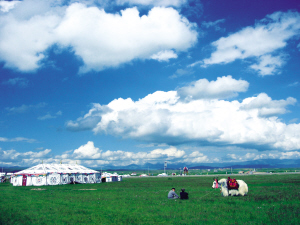 | 美丽的鄂尔多斯大草原,在零星散落的蒙古包映衬下,天空纯净明亮、草地辽阔壮丽、空气清新、牛羊成群,对久居都市的人来说,这一切都是那么遥远而亲切。鄂尔多斯草原,以其宽阔的胸怀、一望无际的蓝天,成为镶嵌在这片广阔而神奇的土地上的一颗璀璨明珠! |