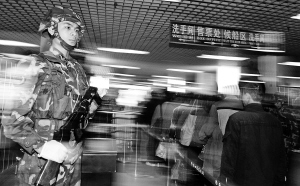 亚运会期间,包括我省在内的广东周边四省一区建设亚运环粤“护城河”工程,防止各类危险物品、可疑车船和人员入粤。 11月4日,海口港客运中心,武警战士加强警戒。 本报记者 李英挺 通讯员 孙勇 摄