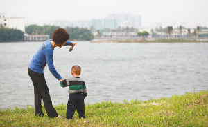 11月3日下午,一对母子在海口红城湖边悠闲赏景。据了解,从2009年7月开始,经过10个月的清淤,红城湖改造于7月底进入蓄水阶段。现在的红城湖碧波荡漾,美景再现,湖面面积达到496亩,比原来扩大了15亩,绿地面积增加了6000多平方米,同时还增加了19万立方米的蓄水量,泄洪、蓄洪的能力进一步提高。 本报记者 张杰 摄