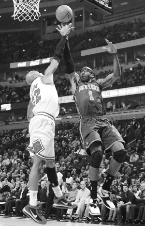 | 北京时间11月5日,在NBA常规赛中,尼克斯队球员斯塔德迈尔(右)在公牛队球员吉布森的防守下投篮。