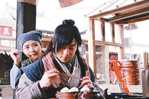 | 何洁(左)与释小龙在片中 |