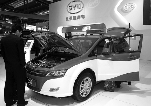 11月5日,一名观众在展会上了解比亚迪公司生产的e6纯电动出租车。目前,深圳已有50辆e6纯电动出租车正式投入使用。 正在深圳会展中心举行的第二十五届世界电动车大会暨展览会上,50多家国产汽车企业选送的整车占总参展汽车企业的近三分之二,不少参展的国产新能源车在设计理念和技术上均达到国际水平,吸引观众目光。 新华社发
