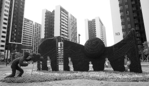 | 媒体村内的一处反映媒体摄像人员工作的植物造型景观。本报特派记者 宋国强 摄 |