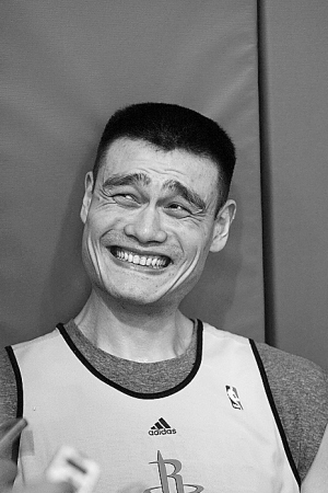 | 10日,姚明在同华盛顿奇才队的比赛前接受记者采访时大笑。 新华社发 |