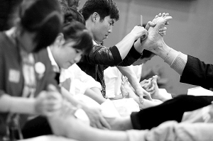 11月12日,在足浴体验区,按摩师正在为参观者按摩。