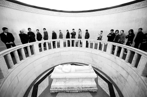 11月12日,游人在中山陵墓室瞻仰孙中山先生卧像。 当日是伟大革命先行者孙中山先生诞辰144周年纪念日,在这个特殊的日子里,南京中山陵陵寝恢复免费开放。陵园入口处的电子屏显示,15时,前来拜谒或参观的人数已突破2万人次。 新华社记者 孙参 摄