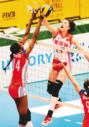 11月13日,在2010年世界女排锦标赛9至12名排位赛中,中国队以3比1战胜古巴队。中国队选手马蕴雯(上)在比赛中扣球。 新华社发