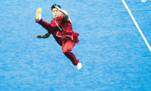 | 11月13日,中国选手袁晓超在武术男子长拳项目的比赛中。 本报特派记者 宋国强 摄 |
