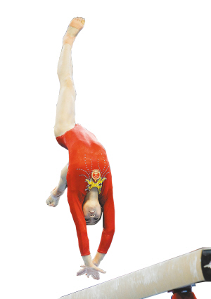 ←14日,由何可欣、邓琳琳、杨伊琳、江钰源、眭禄和黄秋爽组成的中国体操队夺得团体冠军,这也是她们连续第10次获得亚运会女子体操团体金牌。图为中国选手在平衡木比赛中。 本报特派记者 宋国强 摄