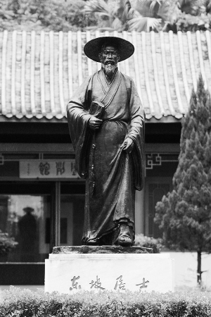 | 东坡书院前的《东坡笠屐》铜像巍然挺立,气势不凡。