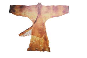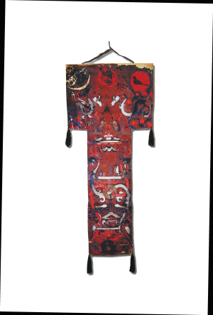 | T形帛画。出土时反盖在辛追墓内棺棺盖上,顶部横裹一根竹杆,在每个垂角下都系着丝带或麻质带子。 |