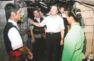 | 11月15日,保亭黎族苗族自治县三道镇什进村,李源潮来到村民家里了解“联村进企”扶贫情况。 本报记者 李英挺 摄 |
