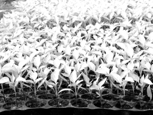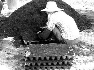 以上原料选择,应力求就地取材,成本低,效果好。根据我们多年的经验,如果采取床土育苗,育苗基质可采用优质园土、腐熟猪牛粪渣和碳化稻壳按5:3:2(体积比)配制而成。经测定:此种复合基质的容重和孔隙度分别0.57和78.5%,pH值为7.252,速效性N、P、K含量分别达0.01165%、1395ppm和675ppm。基本上能满足秧苗的正常生长。如果是采取穴盘育苗,我们推荐使用无土育苗基质,可选用椰糠与猪牛粪按6:4的比例混合堆积,经发酵后使用。育苗基质的pH值,要用石灰调至6~7。