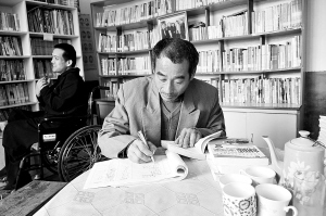 11月17日,在山东省日照市岚山区后村镇西草坡村,村民在“周飞农家书屋”办理借阅手续。山东省日照市的高位截瘫残疾人周飞自办农家书屋,向群众免费提供书籍借阅。书屋自2006年10月29日开设以来藏书已达3000余册,接待读者上万人次。 新华社发(陈为峰 摄)