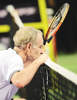 17日,在多哈进行的一场网球表演赛中,麦肯罗以2:0战胜了老对手瑞典人博格。图为麦肯罗在比赛中弹网得分后亲吻球网。 新华社发