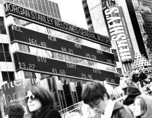 | 11月17日,美国纽约摩根斯坦利总部大楼的电子屏显示出“欢迎通用汽车”字样。