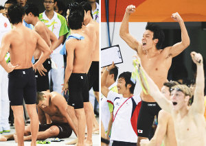 18日,在男子4×100米混合泳接力决赛中,中国队第一个完成比赛,随后却因第二棒选手王帅抢跳犯规而被取消比赛成绩,无缘奖牌。最终,日本队以3分34秒10的成绩夺得冠军。韩国队、哈萨克斯坦队分获亚、季军。左图是日本队赛后向裁判提出异议,在等待结果出来前,第四棒接力选手原田兰丸(下)显得十分忐忑不安;右图是得知中国队因抢跳而被取消成绩时,日本队接力选手立石谅(上)欣喜若狂。旁边的哈萨克斯坦队选手(右一)因为意外获得铜牌而欢呼庆祝。 新华社发