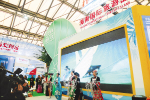 今年是海南国际旅游岛建设的开局之年。今天,海南国际旅游岛无疑是国际旅交会中国馆的热点和焦点。由40个展台组成、面积360平方米的海南展馆紧挨中国国家馆,是所有省市展馆中最吸引眼球的展馆,也是海内外买家进入中国展馆后最先关注的展馆。整个海南展馆里处处洋溢着海南元素:挺拔的椰子树、美丽的海南坡鹿、木船上装载着的各种热带水果……满眼看到的都是海南颜色:大海的蓝色、雨林的绿色、阳光的金黄色……分布在展馆四周的LED大屏幕上,滚动播放着海南宣传片。