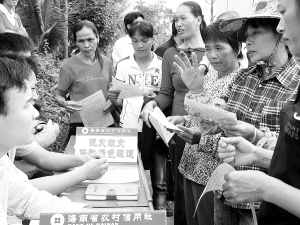 | 在定安龙门镇妇女之家挂牌仪式上,海南农村信用社工作人员向农村妇女讲解小额贷款条件及贷款流程。 本报记者 李英挺 摄 |