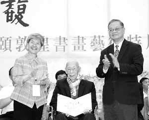 | 95岁的饶宗颐先生(中)在展示敦煌研究院为他颁发的捐赠书画收藏证书 |