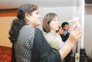 11月20日,在海口举行的“国外汉语教师教材培训班”上,来自巴基斯坦的学员(左一)和来自菲律宾的学员(左二)组合进行写汉字比赛,在快乐的游戏中学习中国文化。 本报记者 李英挺 摄