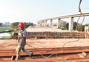 11月21日,在海口市重点项目龙昆南延长线美舍河大桥工地,一名工人正在准备吊运钢材。 目前,美舍河桥下部结构已全部完成,上部结构完成预制梁板140片,两孔之间已架设梁板。美舍河桥长130米、宽38.5米,将于下月贯通。 本报记者 古月 通讯员 陈投 摄