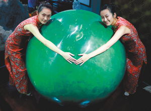 最引人注目是巨型夜明珠(见右图,本报记者张杰摄)。这颗夜明珠重达6吨,直径约为1.6米,在关闭光源的黑暗环境中能发出晶莹透亮的光芒。