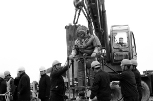 11月21日14时50分许,被困海底近80个小时后,范某随着钢护筒一起被浮吊船的吊钩拉出水面。18日9时15分许,在浙江嘉兴平湖乍浦港区的嘉兴发电厂三期码头取水口工地上,范某进入到一根直径一米多、垂直打入海底的钢护筒底部作业,却不料钢护筒中上部突然发生变形被困海底。图为参与救援的潜水人员准备下水。 新华社发