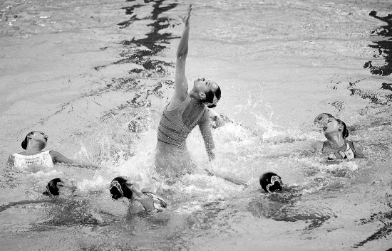 21日,在花样游泳组合决赛中,中国花游队夺得金牌。至此,亚运会花样游泳比赛全部结束,中国队包揽双人、集体和自由自选组合三枚金牌。 图为中国花样游泳队队员在比赛中。 本报特派记者 宋国强 摄 中国花游队 摘得三金