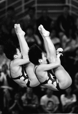 | 23日,中国队陈若琳和汪皓获得10米跳台跳水冠军。 本报特派记者 宋国强 摄