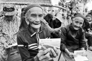 上图为海口市龙华区龙泉镇新江村委会西江村老人在领养老金。