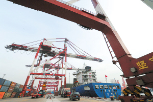 正在装卸货物的青岛港集装箱码头。2010年青岛港用316天的时间吞吐量达到3亿吨,比2009年提前一个月突破3亿吨大关,全年预计吞吐量将突破3.5亿吨,集装箱突破1200万标准箱。“十一五”以来,青岛港吞吐量增长了一倍多,综合能源单耗下降21.6%。 新华社发