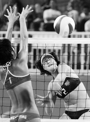23日,在女子沙排决赛中,卫冕冠军薛晨/张希击败队友黄影/岳园夺冠。图为薛晨(右)在比赛中扣球。 本报特派记者 宋国强 摄