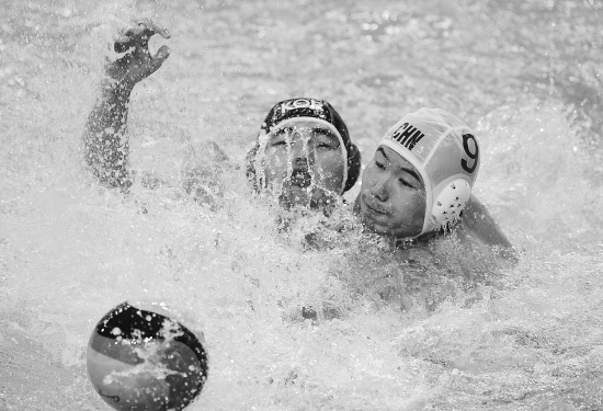 24日,在水球男子半决赛中,中国队以22:9战胜韩国队,闯入决赛。 图为中国队球员谢俊敏(右)与韩国队球员姜俊远在比赛中拼抢。 新华社发 中国男子水球队 闯进决赛