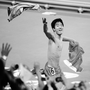 | 夺冠后的刘翔将运动衣抛向观众。 本报特派记者 宋国强 摄